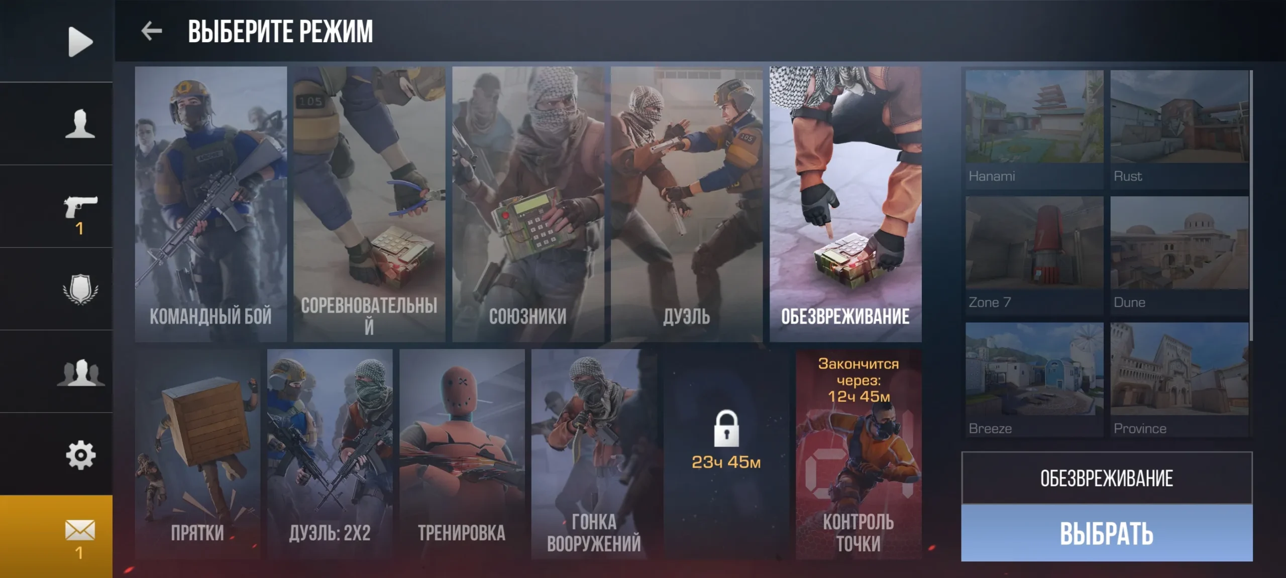 В Standoff 2 предусмотрено множество игровых режимов — от командного боя до увлекательного Дефуза (где одна команда пытается взорвать бомбу, а другая её предотвращает) и классического Смерти по счету.
